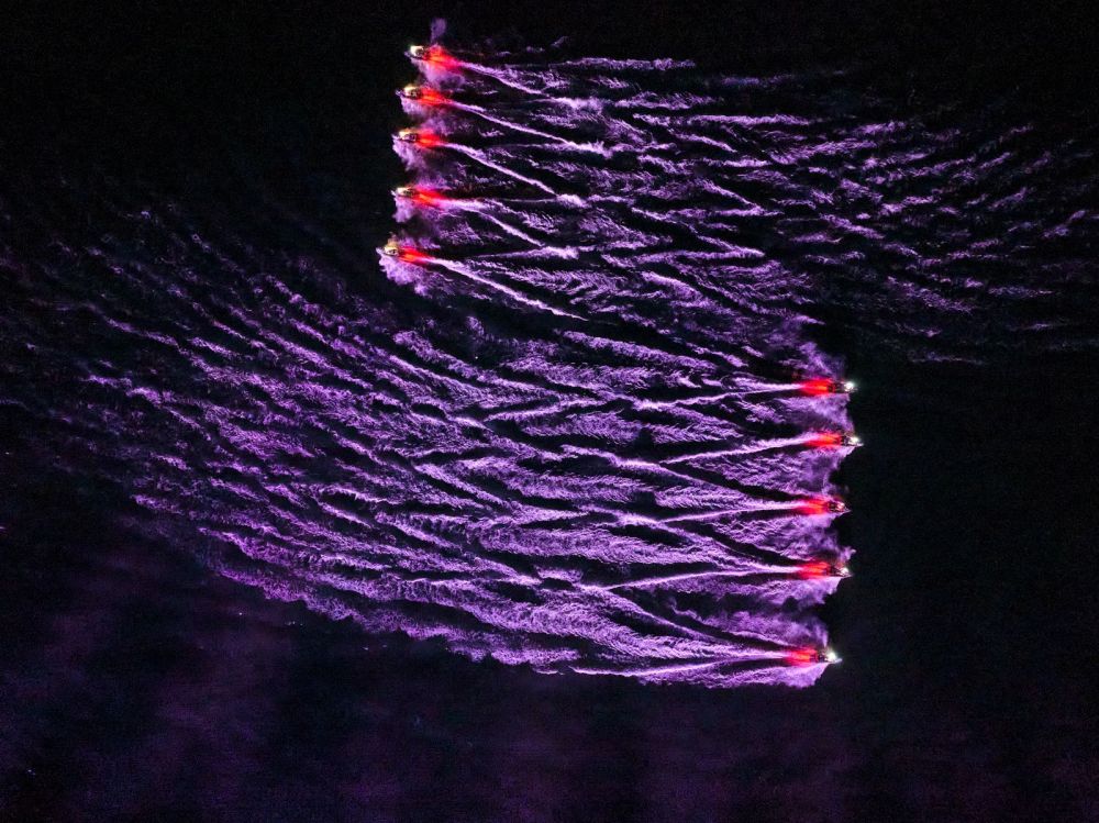 Each jet ski tows 5 kites in a stacked formation with long beautiful tales.