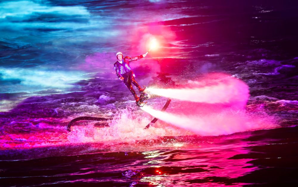 H2O Events has developed a fly board pyro back pack and jet ski pyro pod which features a fireworks show off the back of the fly board pilots and jet skis.